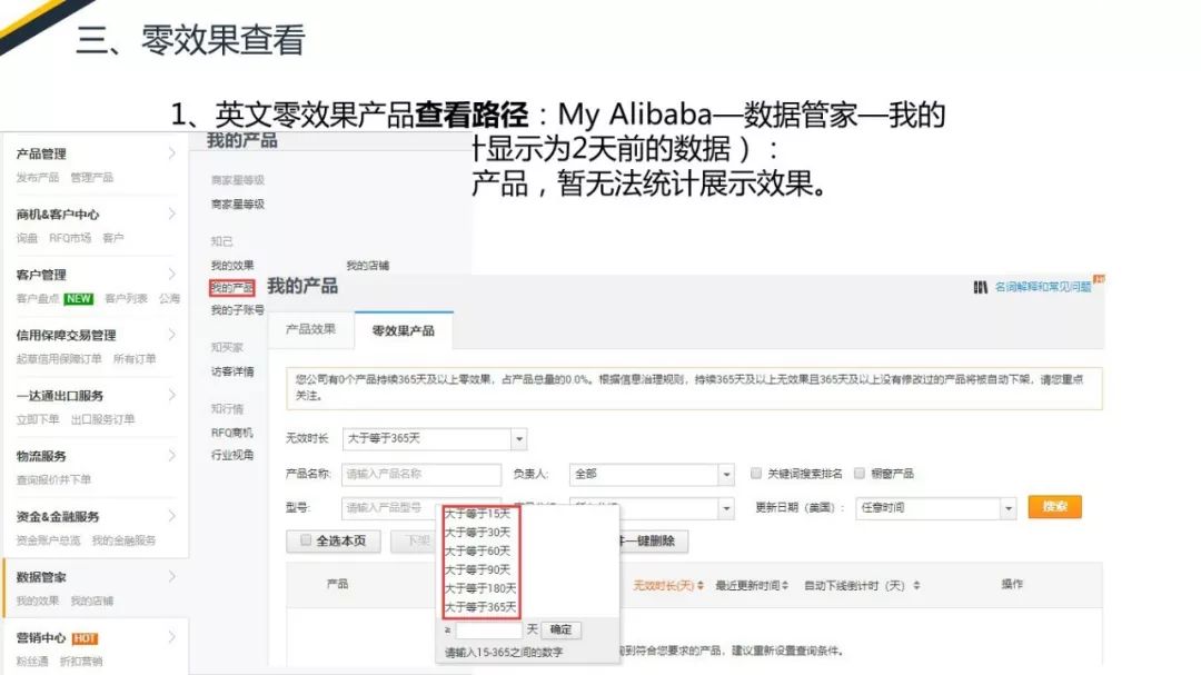 查看路徑教大家一下,My Alibaba界面,點(diǎn)擊數(shù)據(jù)管家,進(jìn)入到我的產(chǎn)品這樣一個(gè)界面。在我的產(chǎn)品這個(gè)界面里面是分為兩塊的。第一塊產(chǎn)品的效果,第二塊零效果產(chǎn)品。點(diǎn)擊第二塊零效果產(chǎn)品,就可以看到平臺(tái)的零效果產(chǎn)品。 統(tǒng)計(jì)的數(shù)據(jù)顯示為兩天前的數(shù)據(jù),官方在設(shè)置工具的時(shí)候,將零效果的實(shí)現(xiàn)進(jìn)行了一個(gè)分段。分別有365天以上的,180以上的,90天以上的,60天以上的,30天以上的,15天以上的。并且你可以不使用人工進(jìn)行輸入。第二個(gè),多元市場(chǎng)的零效果產(chǎn)品暫時(shí)是沒(méi)法被統(tǒng)計(jì)到的。如果你發(fā)布了大量的多元產(chǎn)品并且效果不好,我的建議可以直接刪除,再重新進(jìn)行發(fā)布。