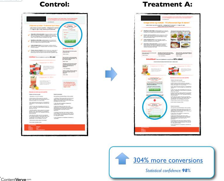 CTA出現的位置很關鍵,下圖是一份關于CTA位置的網絡營銷實驗數據分析報告:提升了304%的轉化