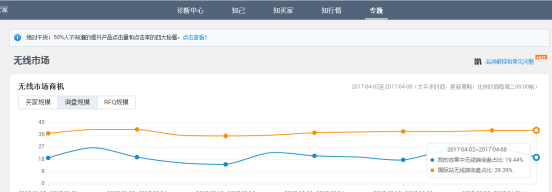 我們以“詢盤規(guī)模”為例,看一下藍(lán)色曲線是“我的效果中無線端詢盤占比”和橙色曲線“國際站無線端詢盤占比”,如圖,橙色數(shù)字是39.39%,表示整個國際站無線端詢盤占了近4成,藍(lán)色19.44%,說明自己的無線端詢盤占比只有不到2成。也就是說,藍(lán)色曲線在橙色線的下面,也就是說明“你無線端詢盤流量”不如“行業(yè)平均值”。