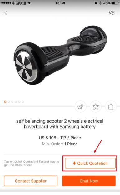 閃電報(bào)價報(bào)名成功后,您在無線買家APP端(Alibaba.com App)的產(chǎn)品詳情頁面上會新增“閃電報(bào)價”入口,如下圖: