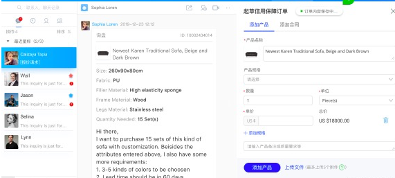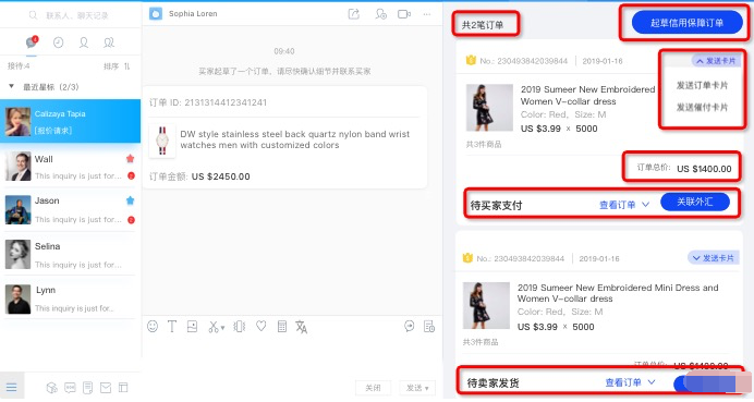 背景:詢盤分配 & 接待+TM咨詢分配 & 接待都可以通過阿里賣家的TM聊天工具完成,所以對(duì)于大多數(shù)商家來說,日常只需要登錄阿里賣家即可處理所有商機(jī)消息,商機(jī)談判下一步就是成交了,現(xiàn)在業(yè)務(wù)人員比較頭疼的問題是每次起草訂單都需要打開網(wǎng)頁版訂單后臺(tái)才能起草,效率低下。這次升級(jí)是在PC阿里賣家聊天頁右側(cè)新增了起草訂單入口,同時(shí)展示與該買家的所有訂單及狀態(tài),具體展示如下: