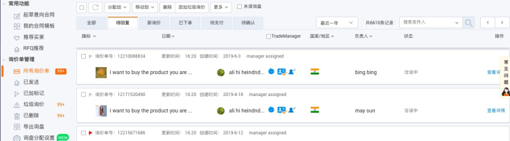 在所有詢價單列表篩選待回復(fù)的詢盤如下圖,標(biāo)題幾乎一樣,之前聊過什么看不出來,只能一封一封點進(jìn)去看,其實不用這么麻煩,用好這個小功能就可以了