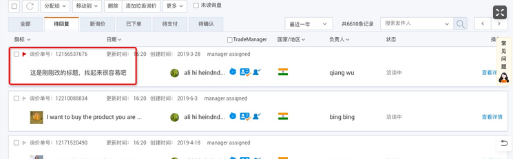 第一次回復(fù)的時候,詢盤詳情頁左上角的標(biāo)題是可以編輯的,每次把重要信息寫在標(biāo)題里就可以了