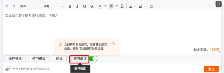 設(shè)置方法:詢盤詳情頁回復(fù)框下方可以開啟或關(guān)閉,點(diǎn)擊”實(shí)時(shí)翻譯“即可進(jìn)行設(shè)置接收語言