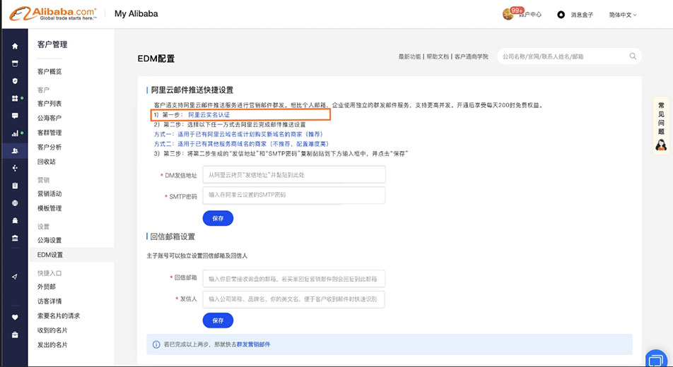操作入口:My Alibaba-客戶管理-EDM配置,具體鏈接配置地址:https://alicrm.alibaba.com/#mail-config