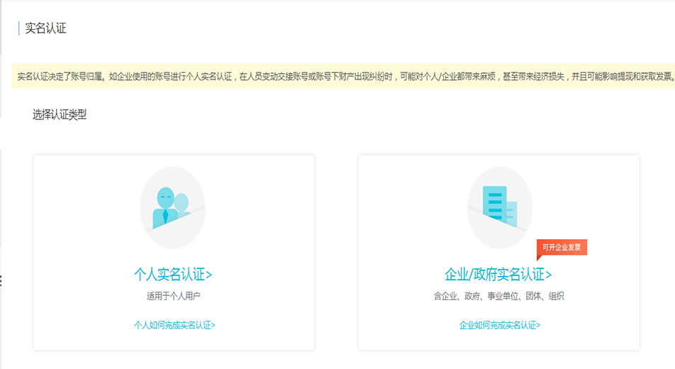 備注:實名認證決定了賬號歸屬。如企業(yè)使用的賬號進行個人實名認證,在人員變動交接賬號或賬號下財產(chǎn)出現(xiàn)糾紛時,可能對個人/企業(yè)都帶來麻煩,甚至帶來經(jīng)濟損失,并且可能影響提現(xiàn)和獲取發(fā)票。