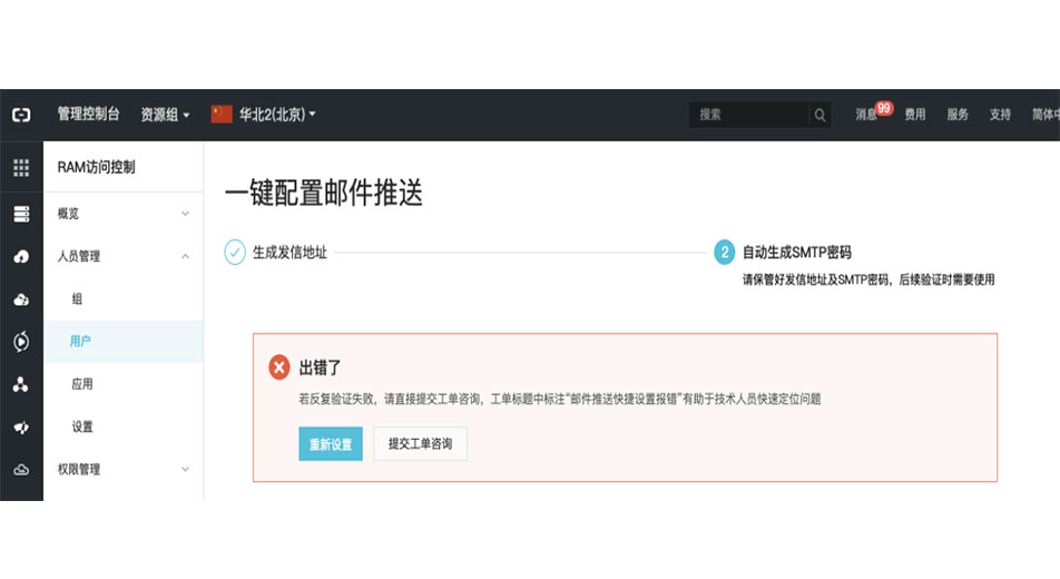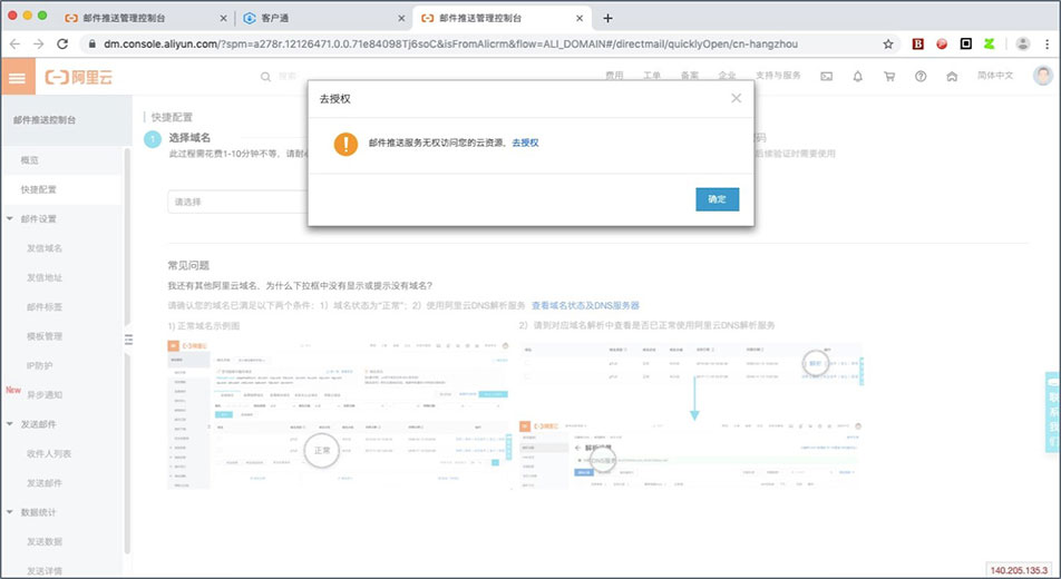 2)再次回到客戶通EDM配置頁面,點擊“方式一”,系統(tǒng)會提示 “郵件推送服務(wù)無權(quán)訪問您的云資源” ,操作授權(quán)