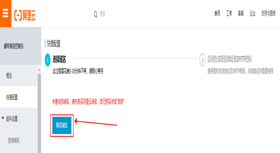 4)若阿里云賬號下無域名,則點擊“購買域名”。域名要完成實名認證(需要1-3天)。