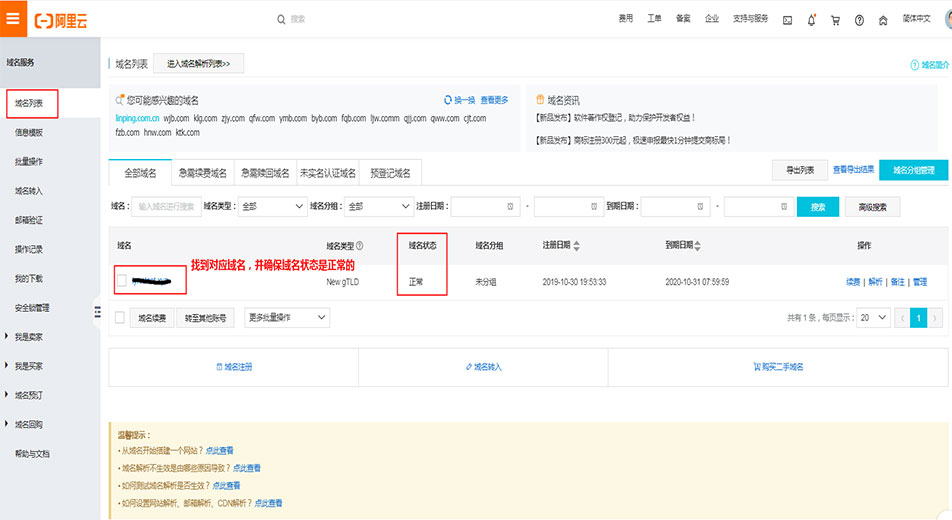 (確定域名處于“正?!睜顟B(tài):https://dc.console.aliyun.com/next/index?#/domain/list/all-domain)