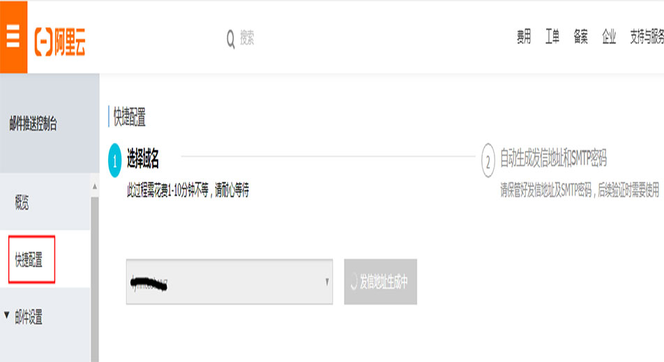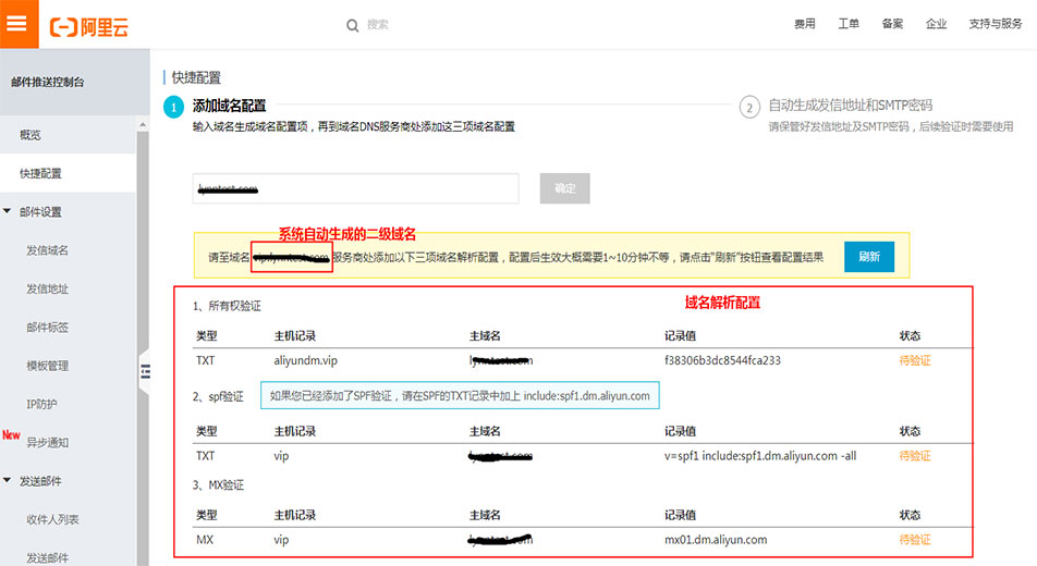 ② 系統(tǒng)會自動執(zhí)行二級域名設(shè)置、DNS解析,發(fā)信地址設(shè)置,SMTP密碼設(shè)置(此步驟比較慢,需要等到1~10分鐘不等)
