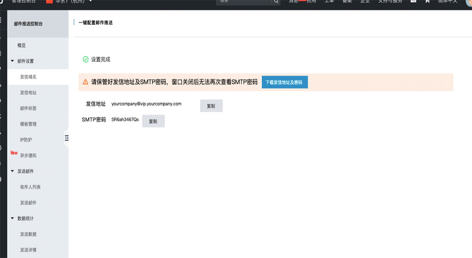 難度小配置快,系統(tǒng)會自動執(zhí)行二級域名設(shè)置,DNS解析,發(fā)信地址設(shè)置,SMTP密碼設(shè)置。