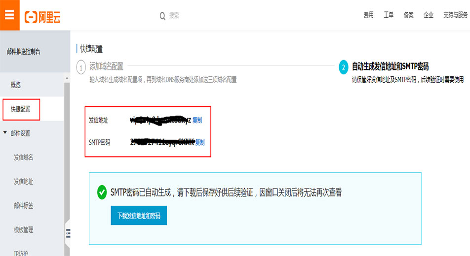 4)域名服務(wù)商配置后生效大概需要1~10分鐘不等,請點擊“刷新”按鈕查看配置結(jié)果。配置成功后會出現(xiàn)發(fā)信地址和SMTP密碼,分別點擊復(fù)制,把結(jié)果復(fù)制到客戶通里面。