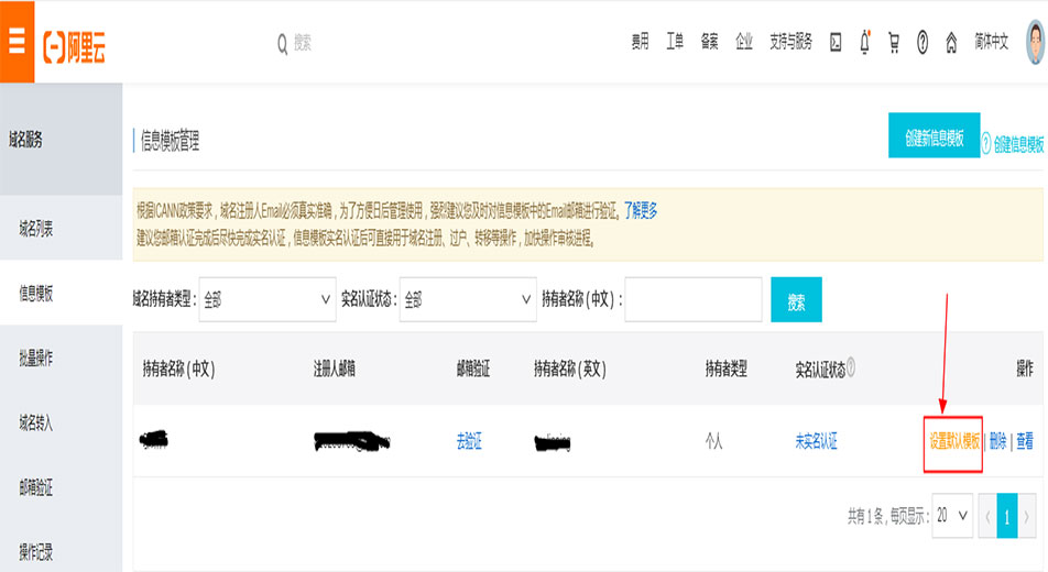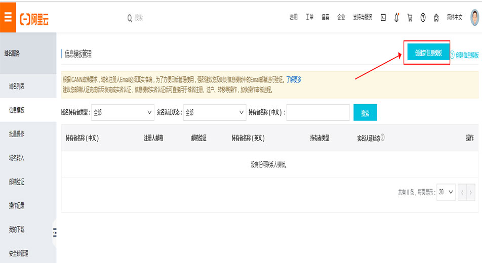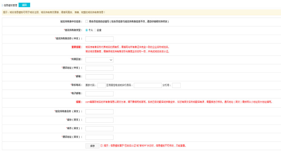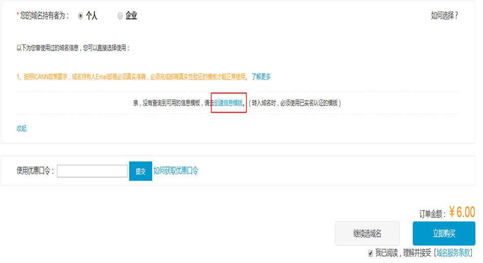 1)確認域名持有者時,需要選擇域名持有者信息模板