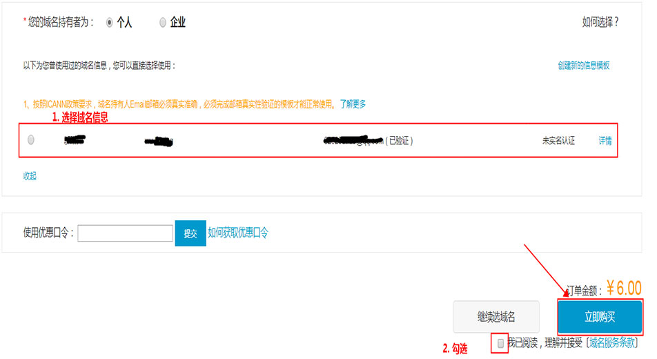 5.確認域名持有者,并勾選條款后,點擊“立即購買”