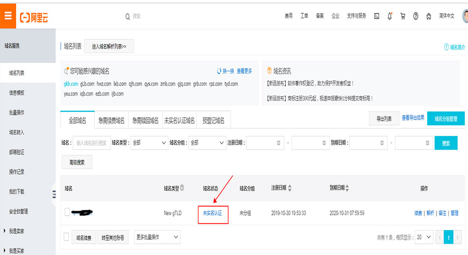 5)域名購買完成后需要進行實名認證,并檢查域名狀態(tài)必須為“正?!?。