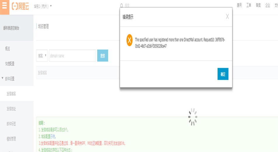 Q:我有阿里云域名,為什么配置EDM時下拉框中沒有顯示域名或提示沒有域名?