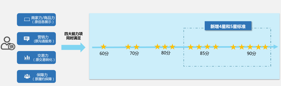 豐富指標(biāo)體系,強(qiáng)調(diào)買家核心關(guān)注點(diǎn),四大能力項(xiàng)一次升級(jí)為:商家力/商品力、營銷力、交易力、保障力;②.細(xì)化分層標(biāo)準(zhǔn),凸顯更多優(yōu)質(zhì)商家,在3星之上孵化出4、5星。1-5星四大能力項(xiàng)分?jǐn)?shù)要求分別是60-70-80-85-90.(可見圖)