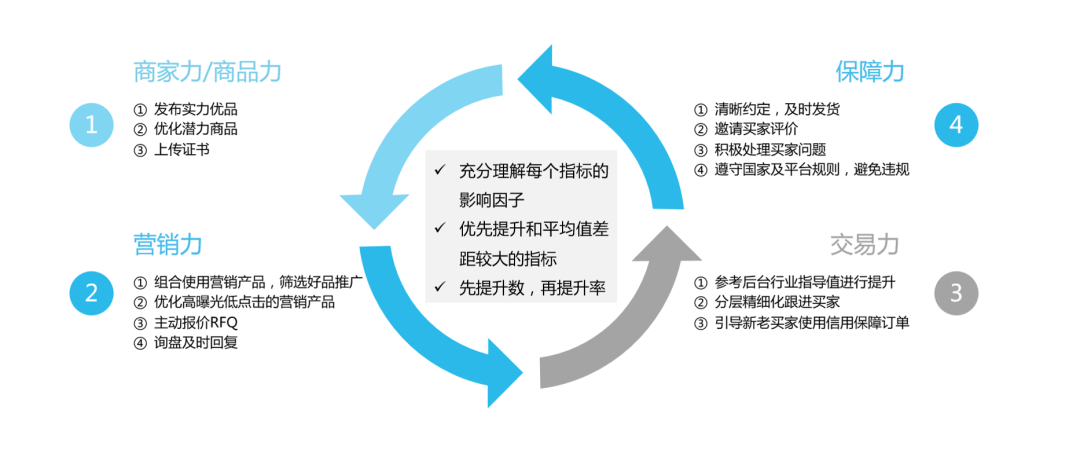 針對(duì)先易后難,在商家力/商品力和保障力是基礎(chǔ),也是相對(duì)容易的提分項(xiàng),如這兩項(xiàng)沒有達(dá)到60分,應(yīng)首先進(jìn)行優(yōu)化提升。營銷力是商家多場景觸達(dá)買家的能力體現(xiàn),需要商家不斷地花費(fèi)心思進(jìn)行優(yōu)化,并通過時(shí)間沉淀展現(xiàn)。交易力是最終效果的直接體現(xiàn),繩鋸木斷、水滴石穿,只有在平臺(tái)上不斷地耕耘,才會(huì)有巨大的收獲。