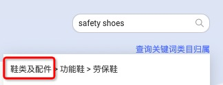 3)在右上角的搜索框中輸入要查詢的關鍵詞“safety shoes”,再點擊“查詢關鍵詞類目歸屬”