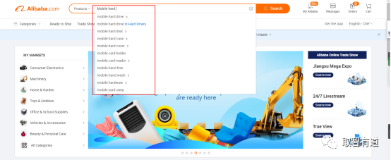 6)在國際站主頁的搜索框搜索,在下拉框里會看到跟輸入的搜索詞相關(guān)的一些長尾詞