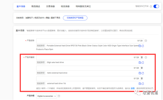 9)在國際站產(chǎn)品發(fā)布時,關(guān)鍵詞填寫處會有系統(tǒng)推薦的熱門詞和藍海詞
