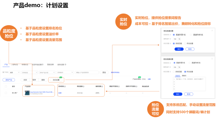搶位流量:指進(jìn)行搶位的投放流量范圍,支持系統(tǒng)匹配或者手動(dòng)設(shè)置。1)系統(tǒng)匹配是根據(jù)計(jì)劃內(nèi)的產(chǎn)品,在考慮效果的基礎(chǔ)上智能匹配搶位流量。2)手動(dòng)設(shè)置是有“包含詞”和“屏蔽詞”兩個(gè)功能,設(shè)置包含詞時(shí),搶位流量包含買家搜索詞,比如設(shè)置dress時(shí),包含dress的搜索詞會(huì)作為搶位流量,多個(gè)“包含詞”取并集確定可匹配的搜索詞范圍,“屏蔽詞”設(shè)置后將屏蔽包含“屏蔽詞”的搜索詞,“包含詞”流量中剔除“屏蔽詞”流量即為最終手動(dòng)設(shè)置投放流量范圍。
