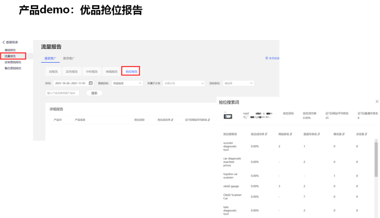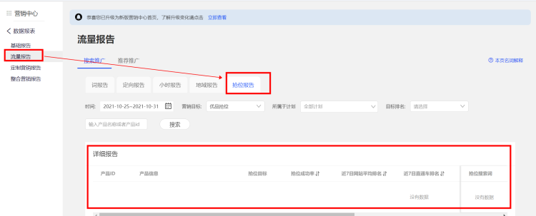 在流量報(bào)告-搶位報(bào)告中可以查看搶位搜索詞、搶到的排名和成功率等數(shù)據(jù)