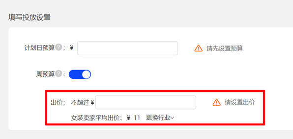 出價(jià):優(yōu)品搶位計(jì)劃僅限區(qū)間出價(jià),建議參考下方的行業(yè)出價(jià),不要低于行業(yè)的平均出價(jià)