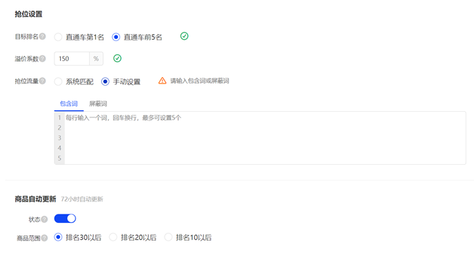 目標(biāo)排名:指您期望搶占的廣告排名,搶第一或者搶前五。當(dāng)設(shè)置搶直通車前5名時(shí),系統(tǒng)會(huì)在您給的溢價(jià)比例內(nèi)針對(duì)直通車廣告位的第1、2、3、4、5廣告位進(jìn)行智能出價(jià),若按照溢價(jià)后最高出價(jià)仍無(wú)法搶占直通車前5名,則不進(jìn)行搶位溢價(jià),按照您的正常出價(jià)參與廣告競(jìng)爭(zhēng)。