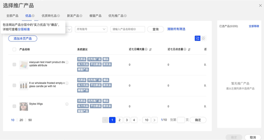 只能添加實(shí)力優(yōu)品和爆品(產(chǎn)品運(yùn)營(yíng)工作臺(tái)定義的),取值會(huì)有T+2的延遲,如果您新增加的實(shí)力優(yōu)品不在選品范圍內(nèi),可以等待2天后添加