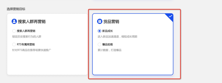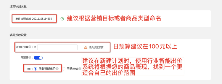 第二步-選擇貨品營(yíng)銷->>新品成長(zhǎng),完成計(jì)劃名稱設(shè)置與預(yù)算設(shè)置;