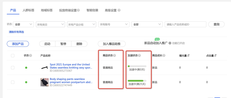 - 選擇優(yōu)先推廣新品(90天內(nèi)新發(fā)布(非編輯),且在關(guān)鍵詞推廣內(nèi)設(shè)置為優(yōu)先推廣的產(chǎn)品),可以快速篩選出想要主推的優(yōu)先推廣新品;