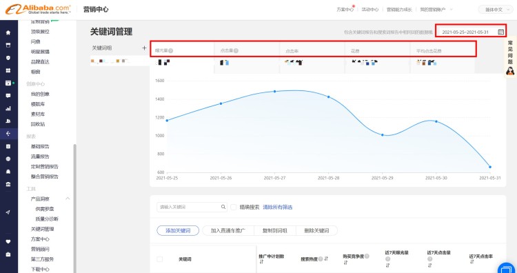 關(guān)鍵詞組列表中,您可以查看關(guān)鍵詞組的曝光、點(diǎn)擊量、點(diǎn)擊率、花費(fèi)等數(shù)據(jù),數(shù)據(jù)延遲T-2天;在右上方可以根據(jù)需要自行修改查詢時(shí)間