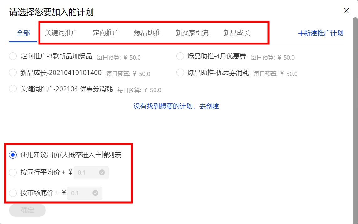 選擇加入直通車推廣后,跳轉(zhuǎn)如下,有三種出價(jià)方式:使用建議出價(jià)、按同行平均價(jià)、按市場(chǎng)底價(jià),點(diǎn)擊確認(rèn)后,可以去關(guān)鍵詞推廣計(jì)劃里修改關(guān)鍵詞出價(jià)