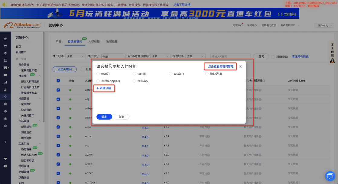 選擇要加入的分組,或者直接新建分組,同時(shí)右上方可以點(diǎn)擊查看關(guān)鍵詞管理
