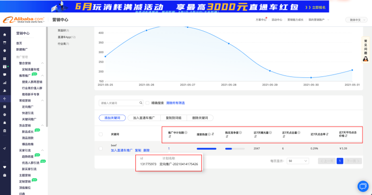 點(diǎn)擊推廣中計(jì)劃數(shù)列表下對(duì)應(yīng)的數(shù)字,會(huì)顯示該關(guān)鍵詞所處的計(jì)劃名稱和計(jì)劃ID