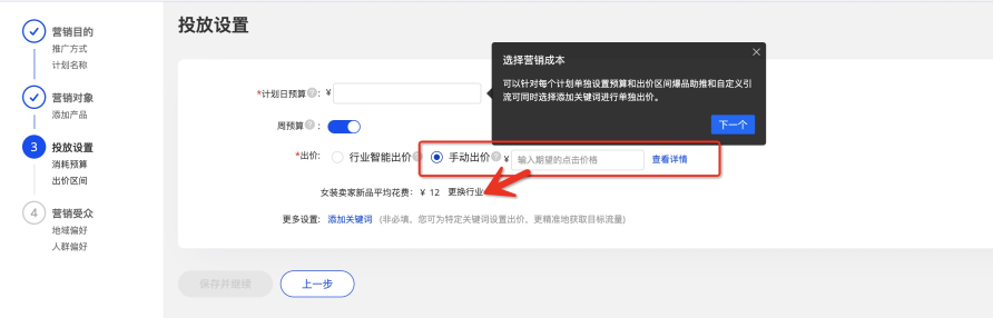 第三步:設置預算與出價,出價要科學,過低會影響商品流量的獲??;