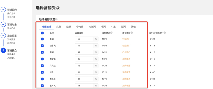 國家選擇思路1:您可以根據(jù)計劃中產(chǎn)品的主打國家,進行目標國家的溢價設置;溢價率*計劃出價得出的價格越高,您在該國家的競爭率就越高;
