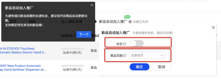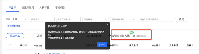 您可以勾選【新品自動加入推廣】,來實現(xiàn)自動更新,開啟該功能后,預計商品將在您發(fā)布且上架后,次日自動選入,加入您的新品計劃中進行推廣~