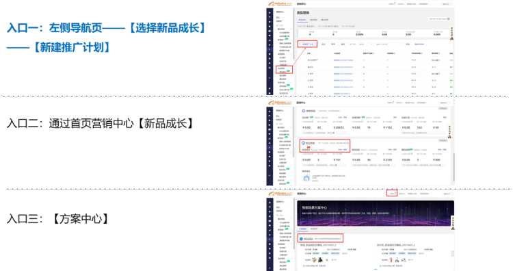 您可以通過首頁營銷中心【新品成長】,或者【方案中心】,以及直接【新建計劃】,來新建【新品成長】的計劃