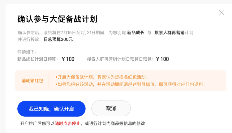 在您點擊報名后,系統(tǒng)將根據(jù)對應階段的營銷節(jié)奏與您當前的投放現(xiàn)狀為您創(chuàng)建計劃,將優(yōu)先選擇您投放中效果表現(xiàn)較好、大促報名商品,您可以在開啟后,自主調整計劃內(nèi)商品、出價、預算(搜索計劃預算不可低50,推薦計劃預算不可低于100)