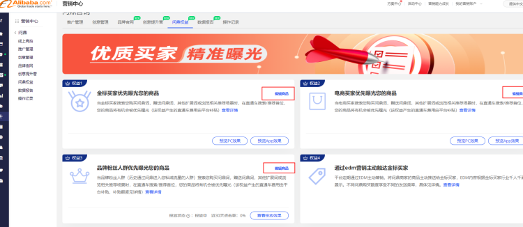 進(jìn)入營(yíng)銷中心-問(wèn)鼎后臺(tái)-問(wèn)鼎權(quán)益,如下圖1點(diǎn)擊權(quán)益1/2/3任意一個(gè)板塊右上角的“編輯商品按鈕”,