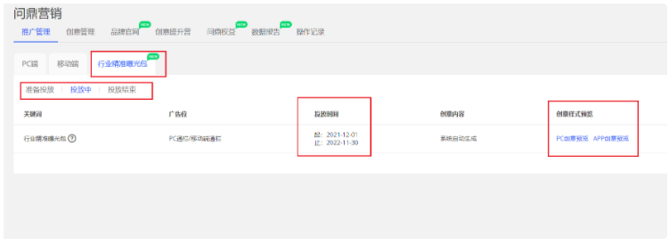 如下圖,,在問(wèn)鼎后臺(tái)-推廣管理中-看見“行業(yè)精準(zhǔn)曝光包”的tab,準(zhǔn)備投放或投放中有相應(yīng)的投放計(jì)劃,即表示貴公司已經(jīng)獲得該權(quán)益
