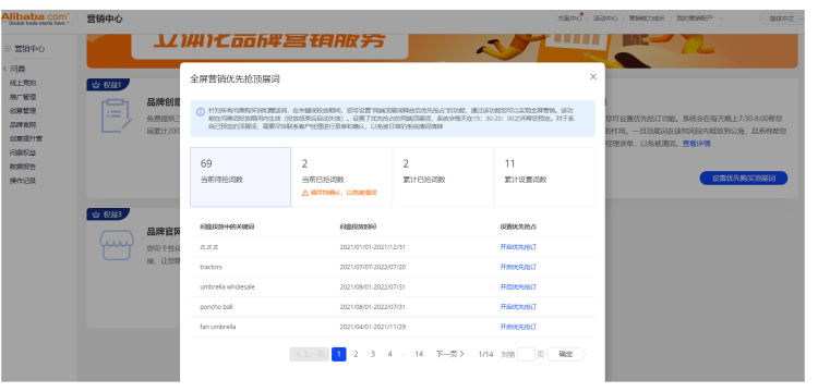 問鼎商家需要登錄 MA后臺(tái)-營銷中心-問鼎后臺(tái)-問鼎權(quán)益中心,找到該權(quán)益,將您想要搶訂的頂展詞,點(diǎn)擊“開啟優(yōu)先搶訂”