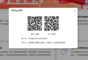 第三步:購買移動端關(guān)鍵詞用戶,選擇“金標買家優(yōu)先曝光您的商品”,點擊下方“預覽APP效果”,系統(tǒng)會彈出對應的二維碼。
