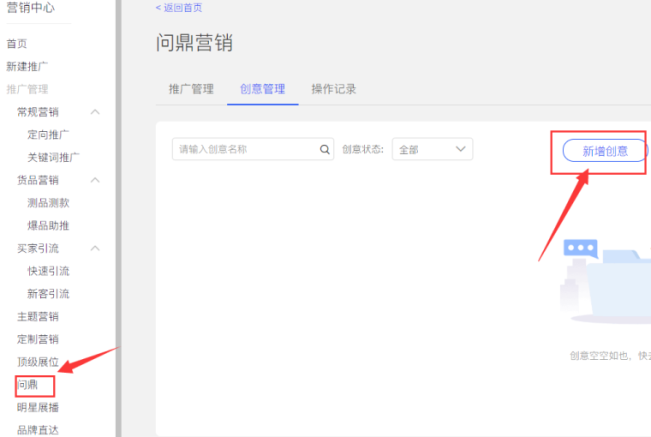 進入直通車營銷中心-右側(cè)導(dǎo)航選擇問鼎-進入問鼎主頁-選擇創(chuàng)意管理-點擊新增創(chuàng)意