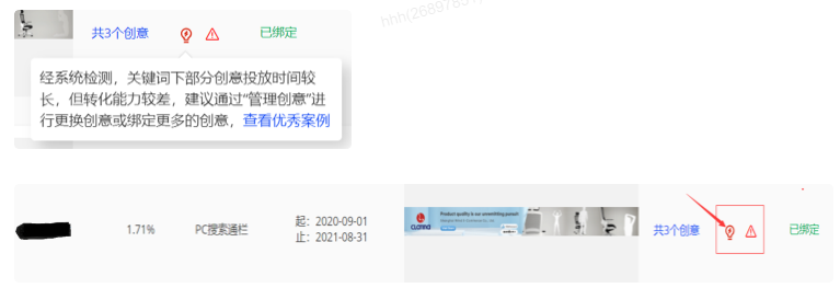劃重點:如下圖當一個創(chuàng)意,投放大于15天,并且點擊率小于1%,系統會給出“紅色燈泡”提醒預警。