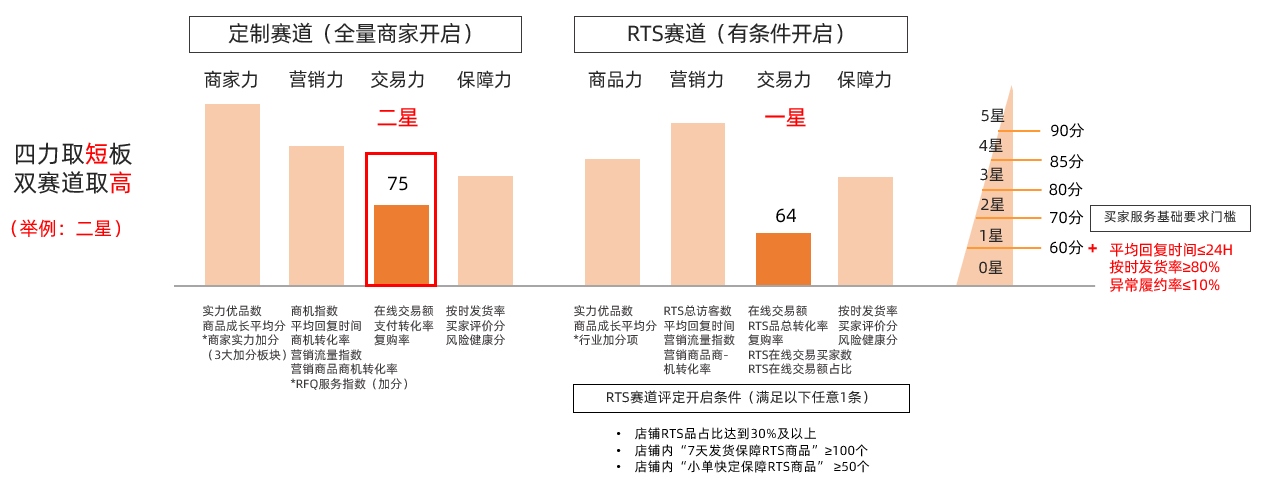 3. 客戶后臺(tái)會(huì)同時(shí)展現(xiàn)定制和快速交易兩套不同場(chǎng)景的評(píng)分指標(biāo)和商家表現(xiàn)數(shù)據(jù),依據(jù)以上規(guī)則確定定制和快速交易星等級(jí)。將取二者中較高的星級(jí)作為商家最終的(預(yù)測(cè)/評(píng)定)星等級(jí)??焖俳灰仔堑燃?jí)僅在商家店鋪RTS品占比達(dá)到30%及以上才開(kāi)啟評(píng)定,未達(dá)到此評(píng)定門(mén)檻時(shí)默認(rèn)0星,定制星等級(jí)不受此影響,對(duì)全量商家進(jìn)行評(píng)定。