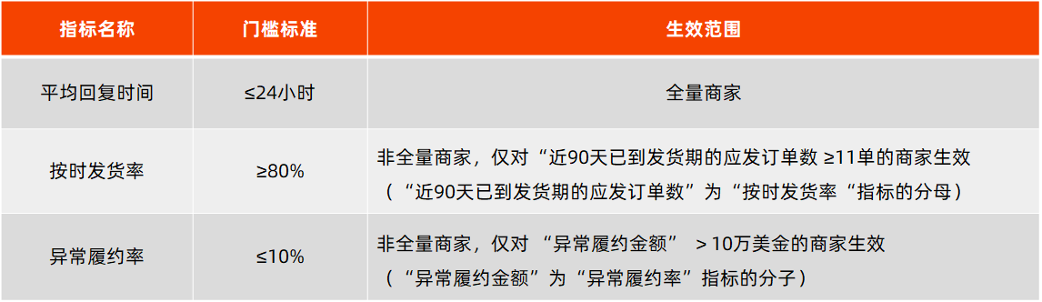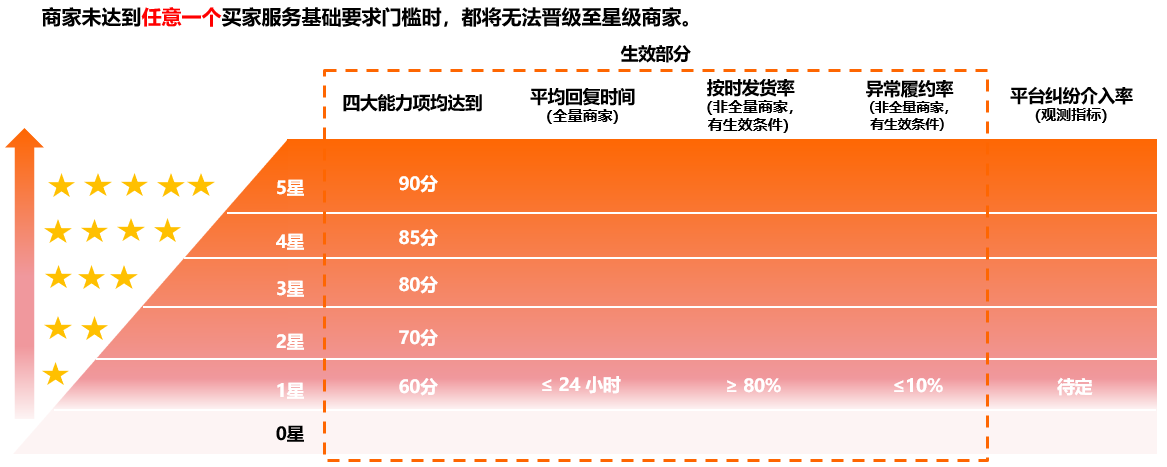 買(mǎi)家服務(wù)基礎(chǔ)要求門(mén)檻的指標(biāo)值和生效條件: