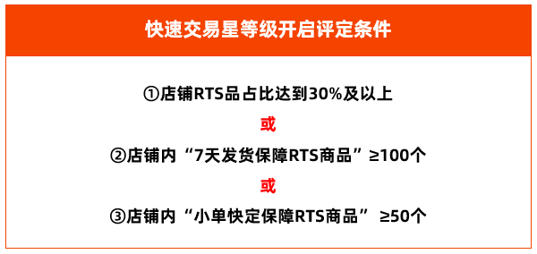 當(dāng)?shù)赇仢M足以下任意一個(gè)條件時(shí),才可開(kāi)啟店鋪快速交易星等級(jí)的評(píng)定,未達(dá)到此評(píng)定門(mén)檻時(shí)快速交易星等級(jí)默認(rèn)0星: